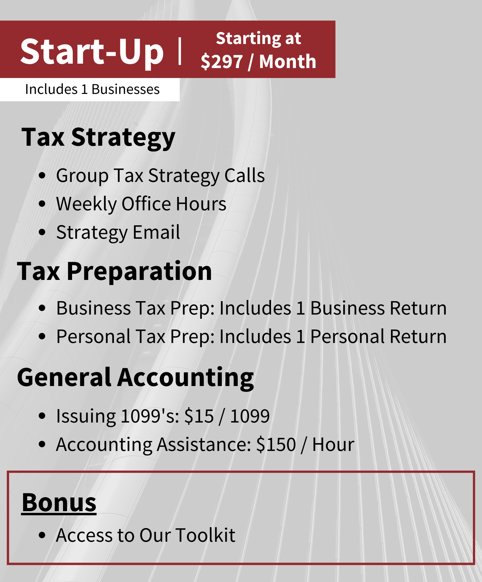 *Bonus* Access to Our Toolkit: Your go-to stop for all things tax strategy, bookkeeping, and tax preparation